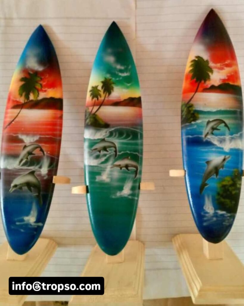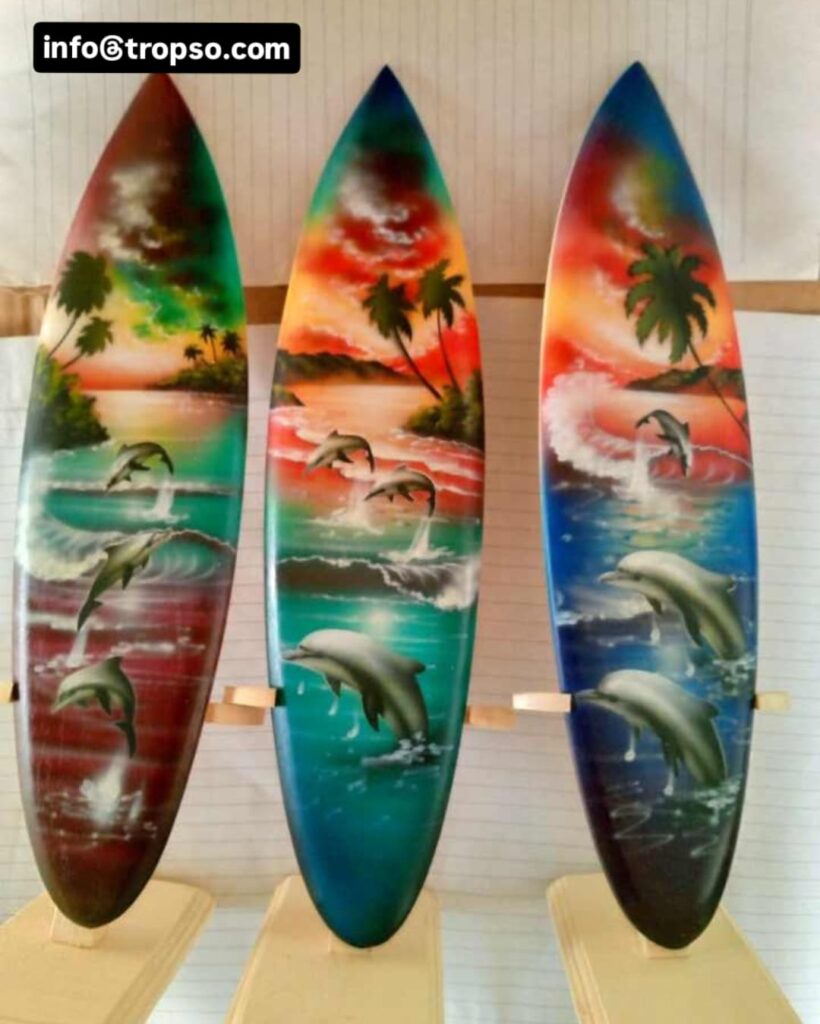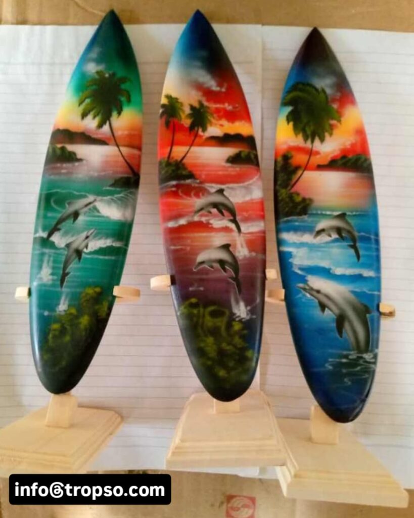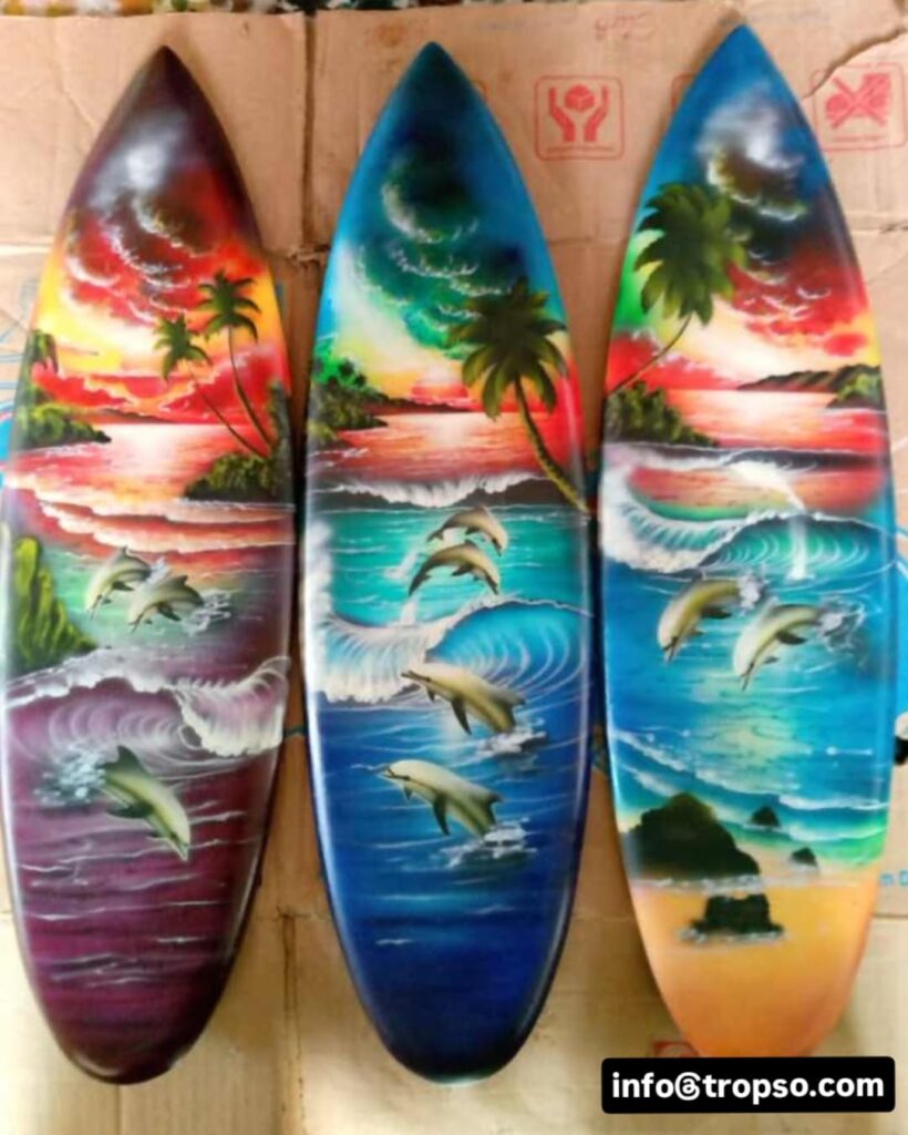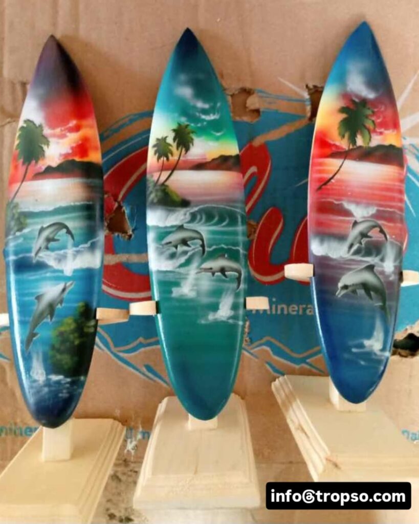 Surfboards are souvenirs made of wood. Surfboards are unique because the surface of the surfboard can be painted with various images such as beach panoramas, animals, tropical plants, and so on. You can even add simple writing such as Bali or the name of someone close to you.